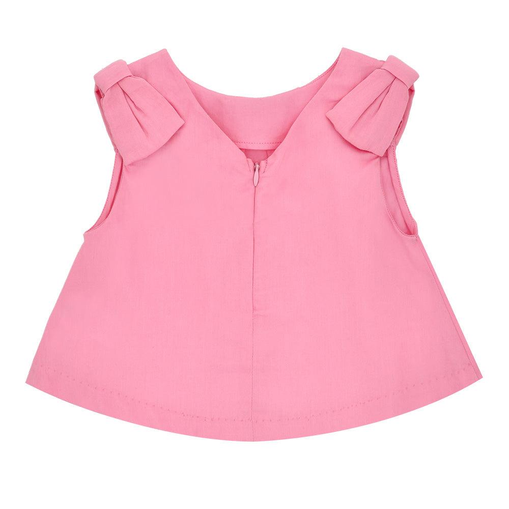 A timeless silhouette with a charming twist. This elegant blouse features a boat neckline with inverted pleats finished with delicate bow details on the sleeves.