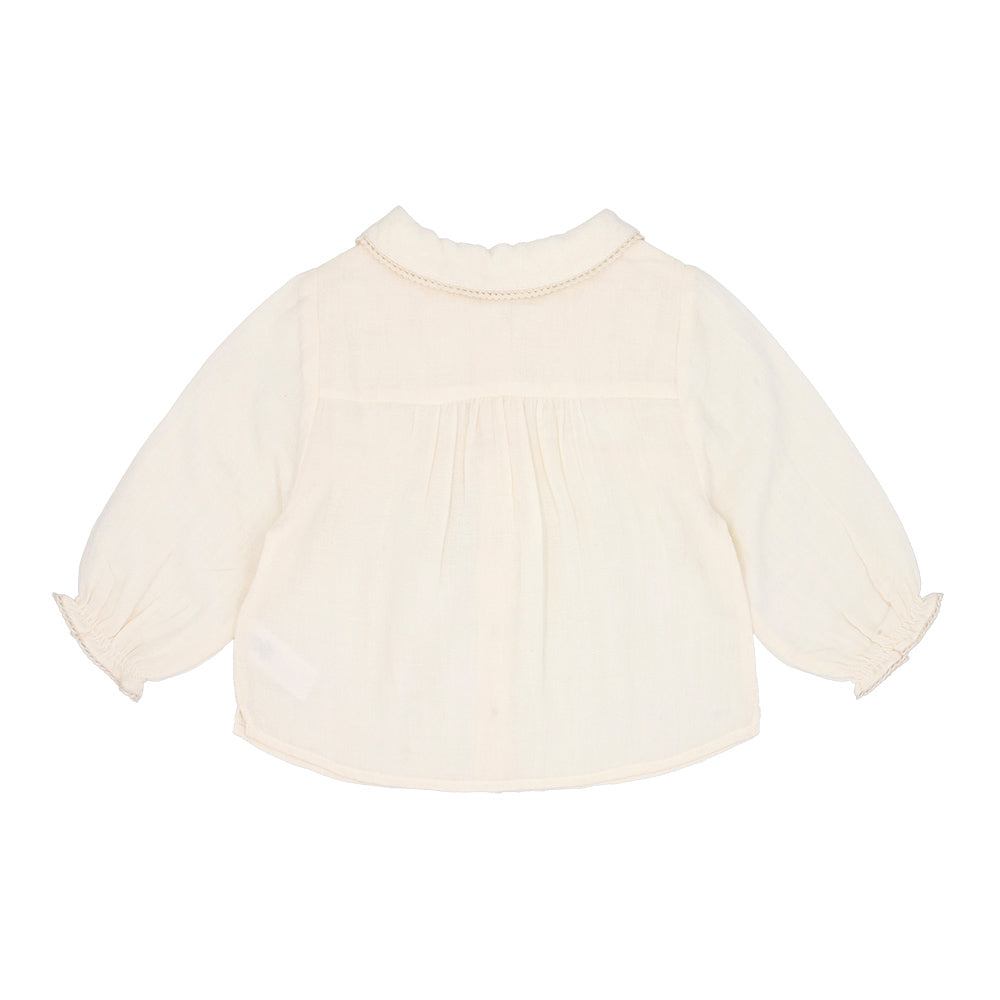 A timeless blouse with embroidered Peter pan collar. Made with soft double layer gauze for added comfort.