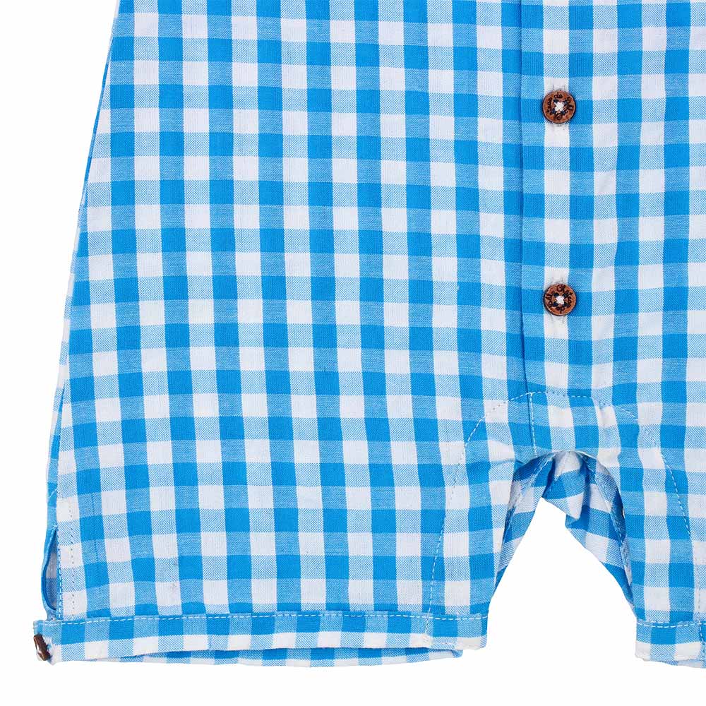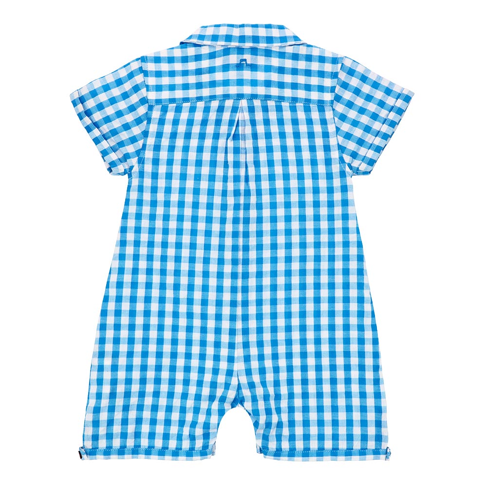 A classic collared romper shirt crafted from lightweight seersucker Vichy checks offers breathable comfort with a timeless look.